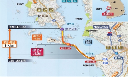 터널이 무너지지 않도록 지반 검사를. 고려시대에 지금까지 쓰이는 이름 보령현으로 개칭되었다. 1공구대천항원산도 69는 해저터널 2공구원산도태안 영목항 18는 해상교량 나머지 54는 접도구간이다.
